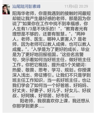 我通过参加了阳海华老师主讲的班主任培训班课后,我把学到的知识运用到实际的班级管理和教学中起到了很好的效果,我所担任的班的学生进步很大,多次受到学校领导的表扬,在上学期期末被评为了文明班和学习先进班,本人的教学成绩在同级学科中排名第一,我觉得真是收获很大,如有机会真是想再次参加,多谢阳老师!